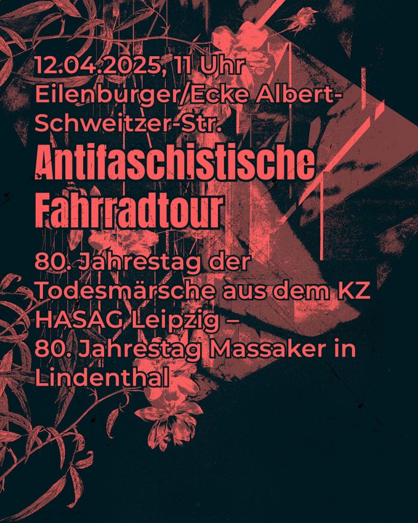 12.04.2025 11 Uhr Lene-Voigt-Park (am Tauschregal -51°19'59.8"N 12°24'16.2"E ) 04317 Leipzig Antifaschistische Fahrradtour - 80. Jahrestag der Todesmärsche aus dem KZ HASAG Leipzig - 80. Jahrestag Massaker in Lindenthal Am … Antifaschistische Fahrradtour – 80. Jahrestag der Todesmärsche aus dem KZ HASAG Leipzig – 80. Jahrestag Massaker in Lindenthal weiterlesen